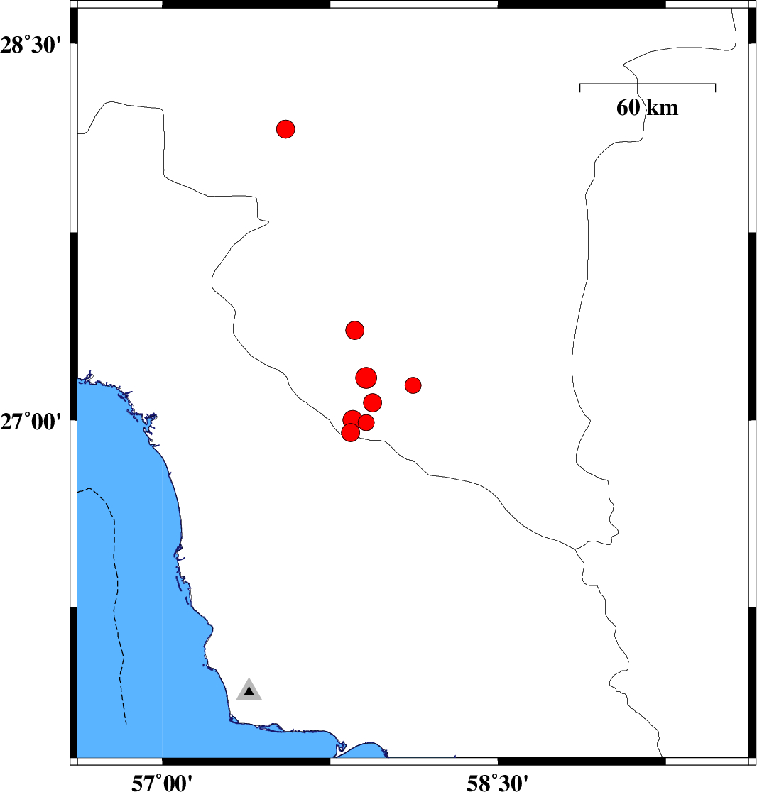| 2019/11/18 | 08:08:59.6 | 11:38:59.6 | 28.16 | 57.55 | 14 | ML:3.6 | Kerman Province, 27 km North-West of Kahnuj | ||
