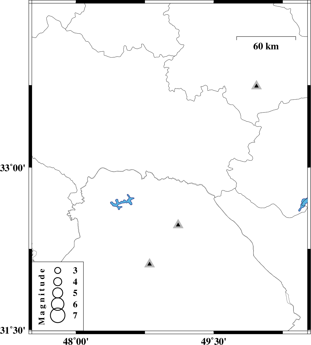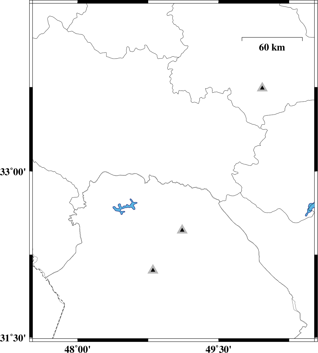 | 2019/11/22 | 19:42:42.9 | 23:12:42.9 | 32.99 | 49.02 | 10 | ML:3.2 | Lorestan Province, 55 km South of Dorud |
