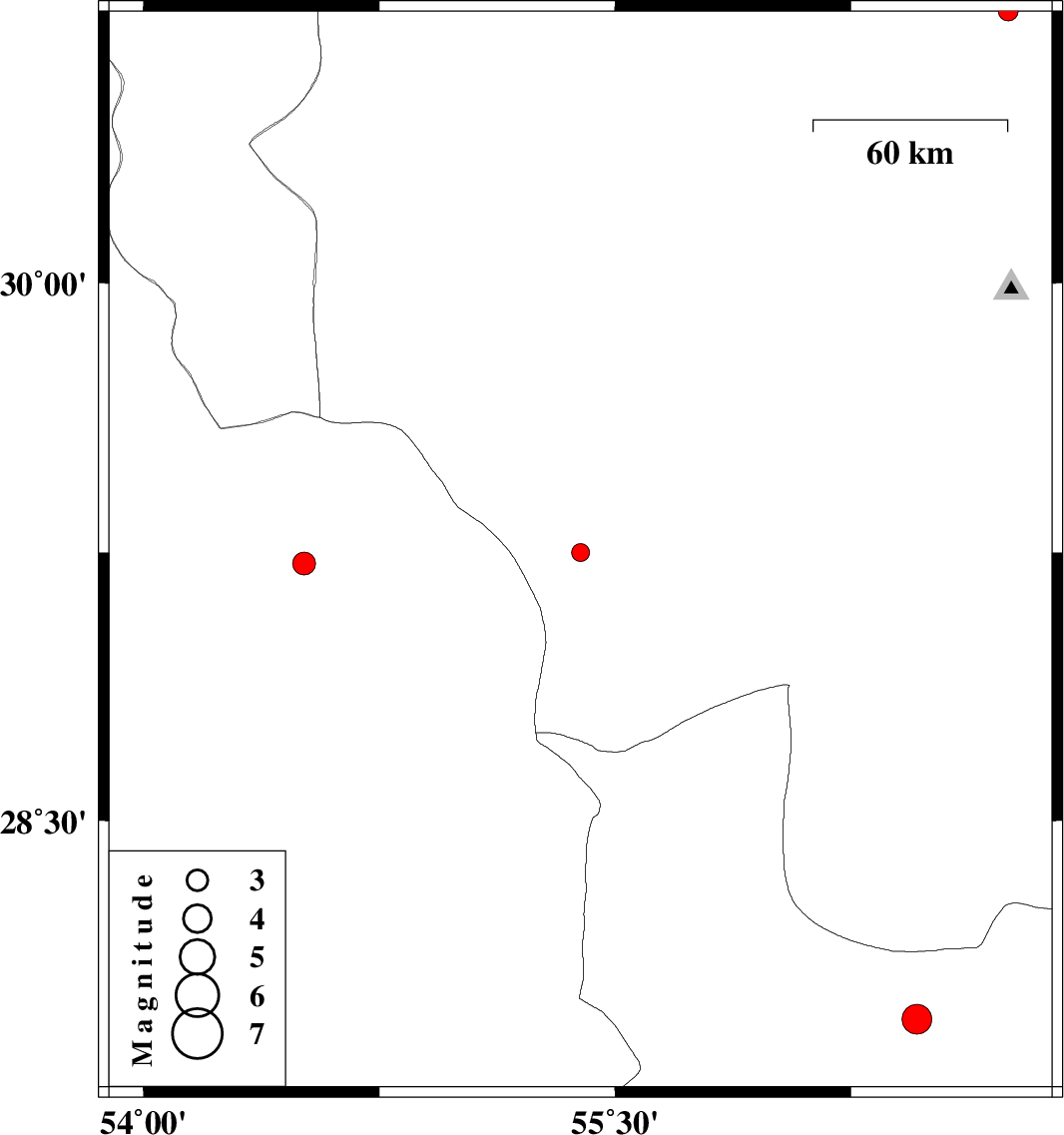 | 2019/11/05 | 01:17:55.8 | 04:47:55.8 | 28.14 | 54.34 | 14 | ML:2.9 | Fars Province, 51 km North of Lar |