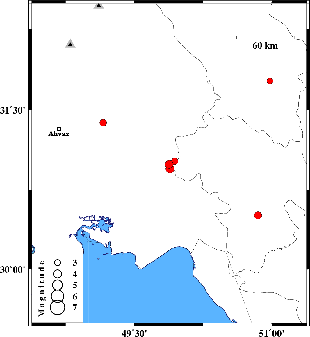 | 2019/11/23 | 13:45:32.9 | 17:15:32.9 | 30.99 | 49.88 | 12 | ML:3.9 | Khoozestan Province, 30 km North-East of Omidiyeh | ||