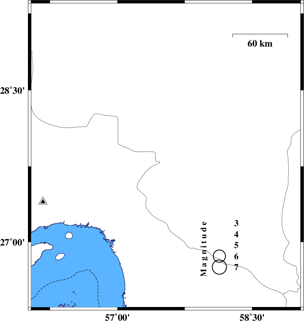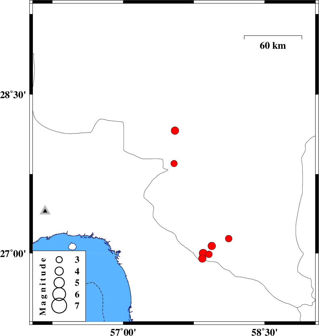 | 2019/11/18 | 08:08:59.6 | 11:38:59.6 | 28.16 | 57.55 | 14 | ML:3.6 | Kerman Province, 27 km North-West of Kahnuj |
