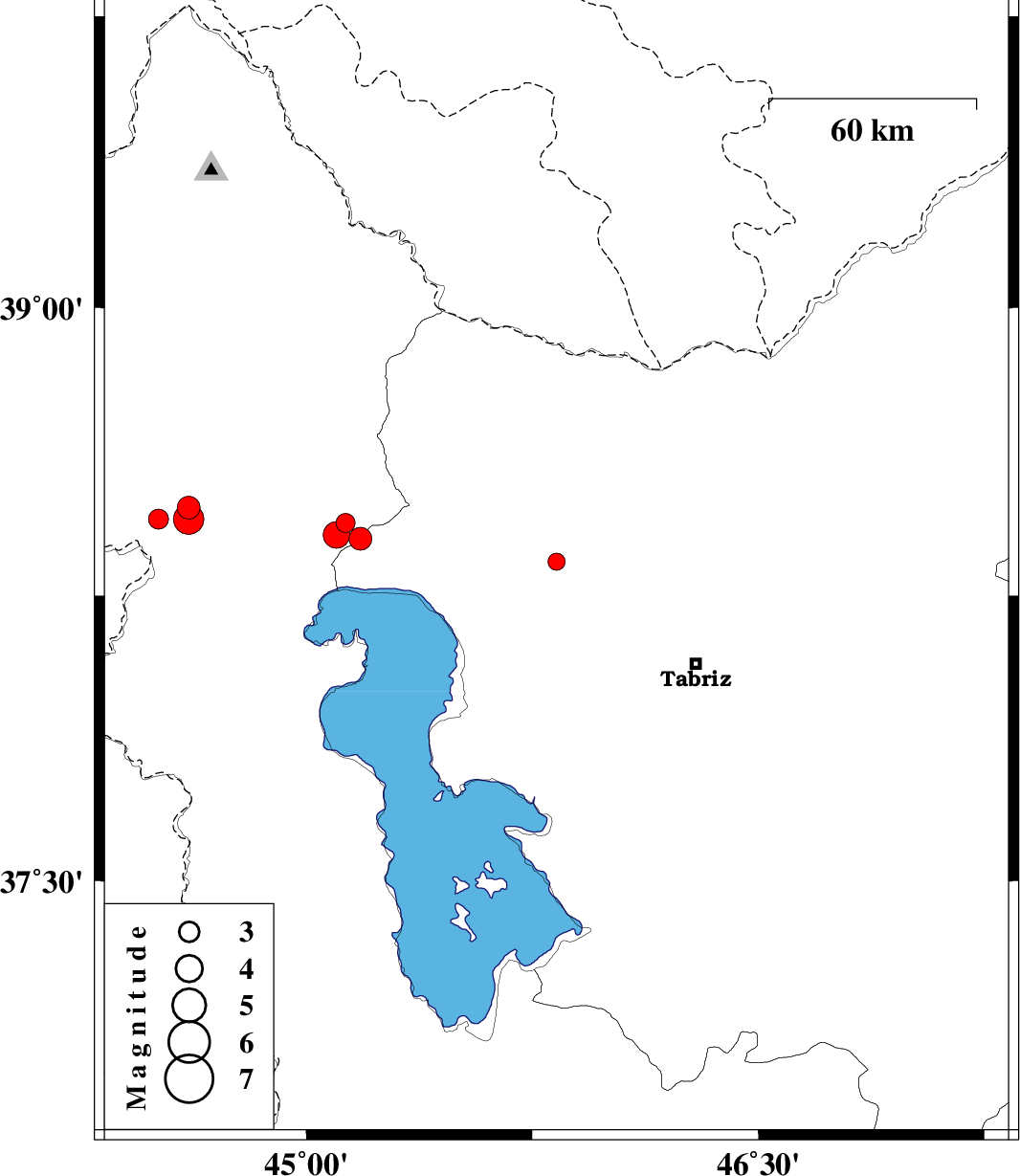| 2019/11/23 | 19:21:45.3 | 22:51:45.3 | 37.34 | 44.77 | 14 | ML:2.8 | Azarbaijan Gharbi Province, 35 km South-West of Orumiyeh | ||