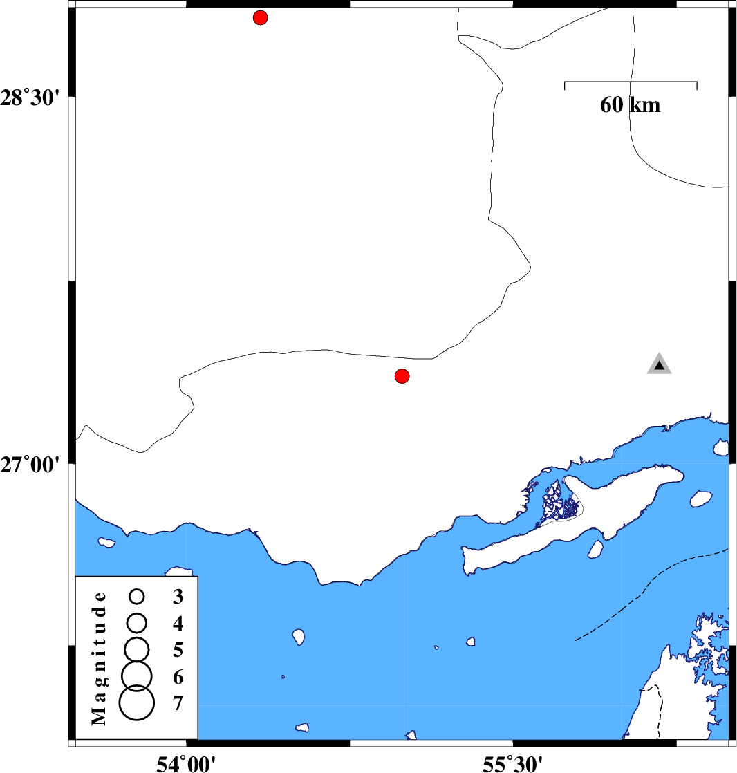 | 2019/11/30 | 22:56:18.6 | 02:26:18.6 | 27.36 | 54.99 | 14 | ML:3 | Hormozgan Province, 65 km North-East of Bastak | ||