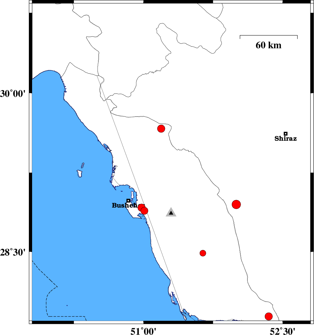 | 2019/11/25 | 12:30:52.1 | 16:00:52.1 | 29.77 | 50.64 | 14 | ML:3.6 | Bushehr Province, 25 km North-East of Bandar-e genaveh | ||