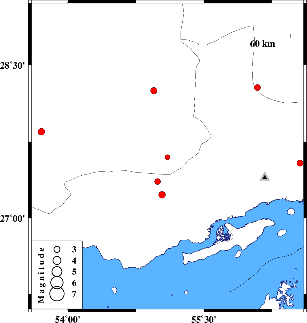 | 2019/11/29 | 21:23:06.4 | 00:53:06.4 | 27.54 | 56.56 | 10 | ML:3.1 | Hormozgan Province, 48 km North-East of Bandar-e abbas |