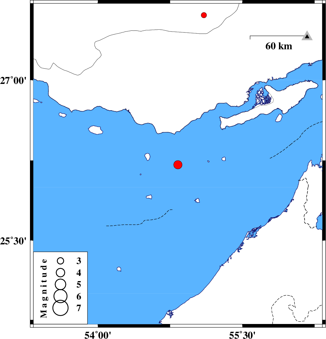 | 2019/12/12 | 14:25:05.8 | 17:55:05.8 | 26.21 | 54.83 | 14 | ML:3.9 | Persian Gulf, 35 km South of Bandar-e lengeh | ||