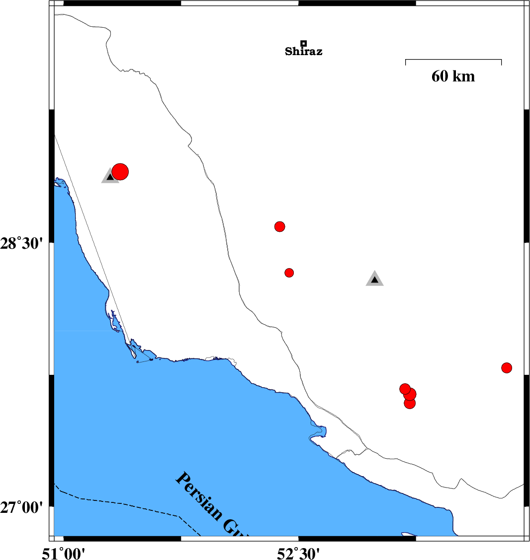 | 2019/12/27 | 01:53:11.1 | 05:23:11.1 | 28.9 | 51.36 | 10 | ML:4.8 | Bushehr Province, 10 km -East of Ahram | ||