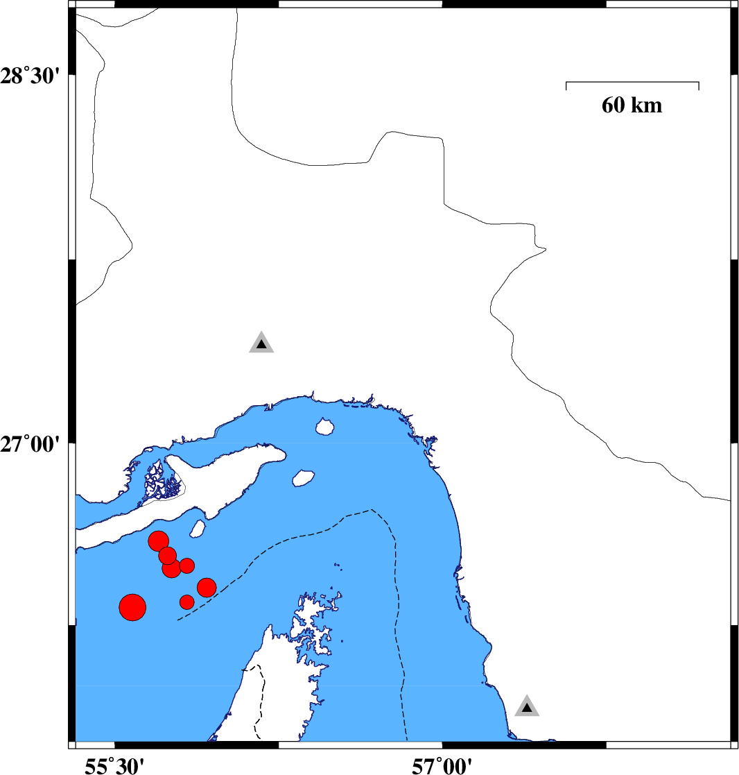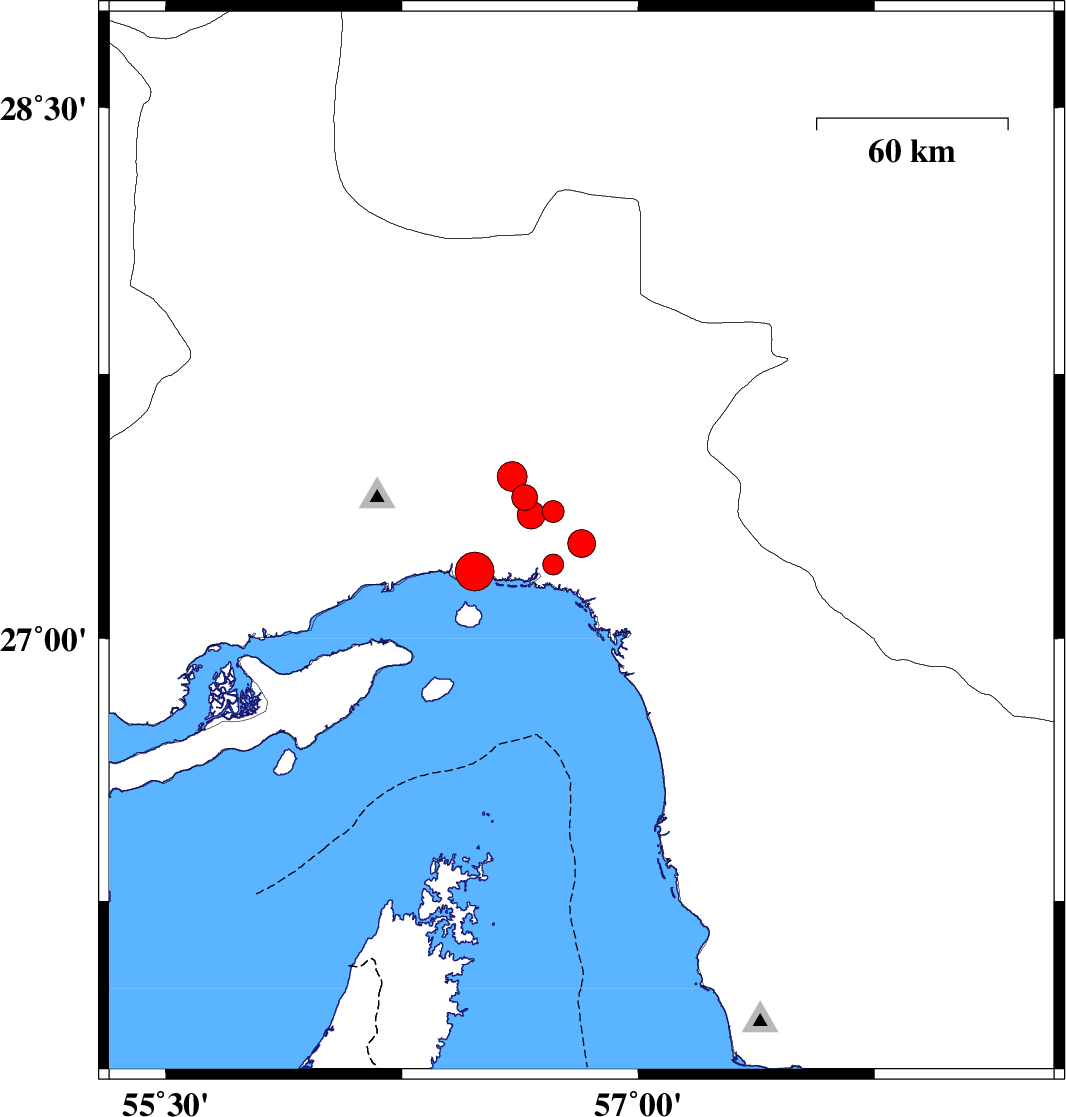 | 2019/12/30 | 13:54:39.7 | 17:24:39.7 | 27.46 | 56.6 | 10 | ML:4.3 | Hormozgan Province, 44 km North-East of Bandar-e abbas | ||