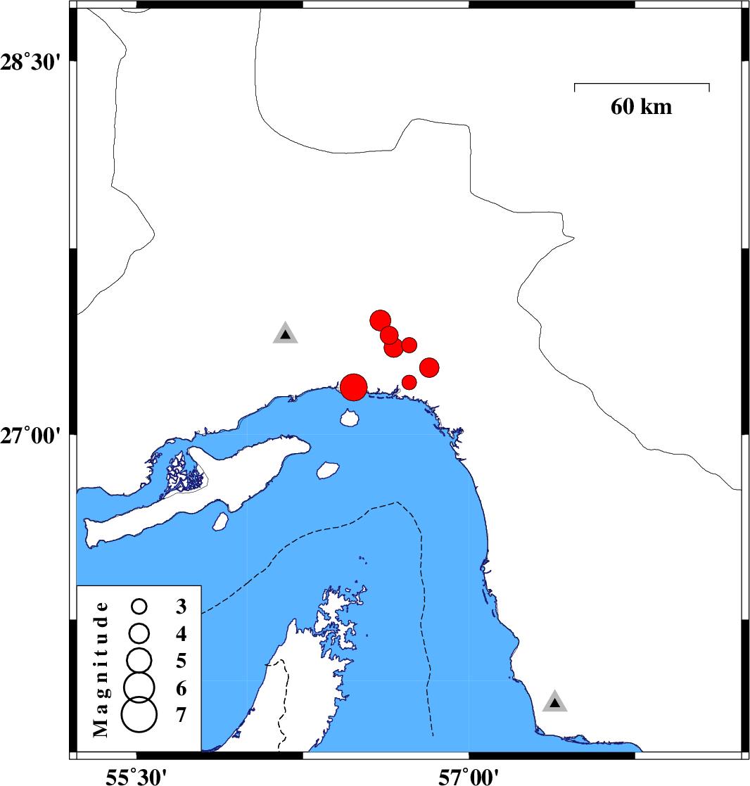 | 2019/12/30 | 13:54:39.7 | 17:24:39.7 | 27.46 | 56.6 | 10 | ML:4.3 | Hormozgan Province, 44 km North-East of Bandar-e abbas | ||