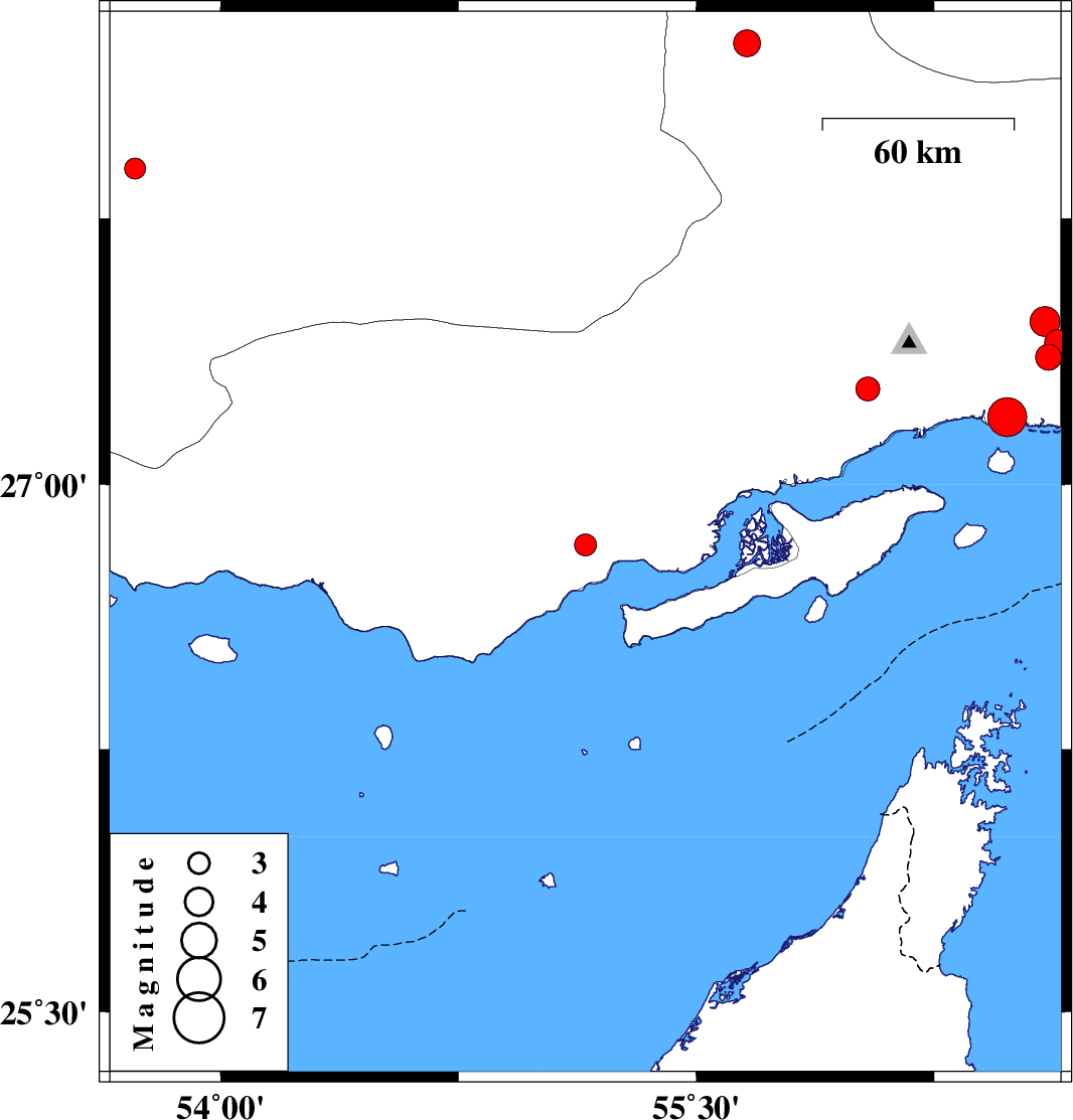 | 2020/01/06 | 17:03:18.2 | 20:33:18.2 | 26.83 | 55.15 | 10 | ML:3.1 | Hormozgan Province, 45 km North-East of Bandar-e lengeh | ||
