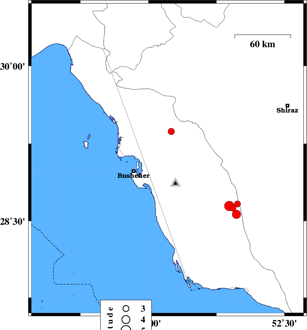 | 2020/01/08 | 03:19:14.9 | 06:49:14.9 | 29.1 | 51.21 | 10 | ML:4.2 | Bushehr Province, 18 km South of Borazjan | ||
