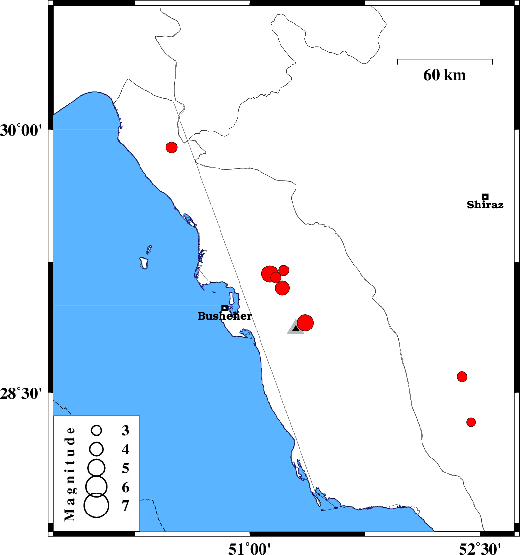 | 2020/01/08 | 03:46:46.7 | 07:16:46.7 | 29.16 | 51.17 | 10 | ML:3.1 | Bushehr Province, 12 km South of Borazjan | ||