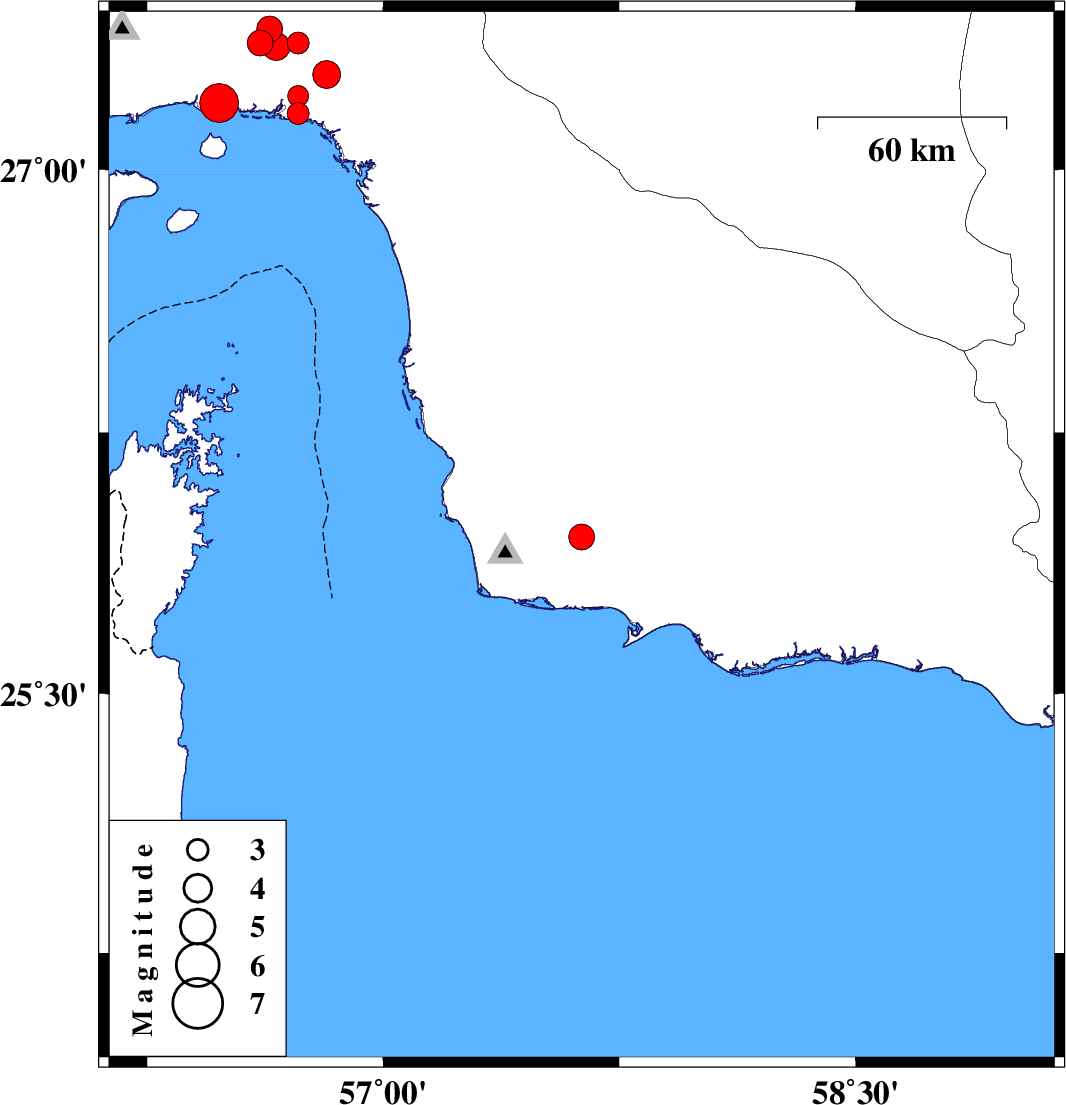 | 2020/01/11 | 09:50:15.1 | 13:20:15.1 | 25.95 | 57.63 | 10 | ML:3.6 | Hormozgan Province, 38 km North-West of Jask | ||
