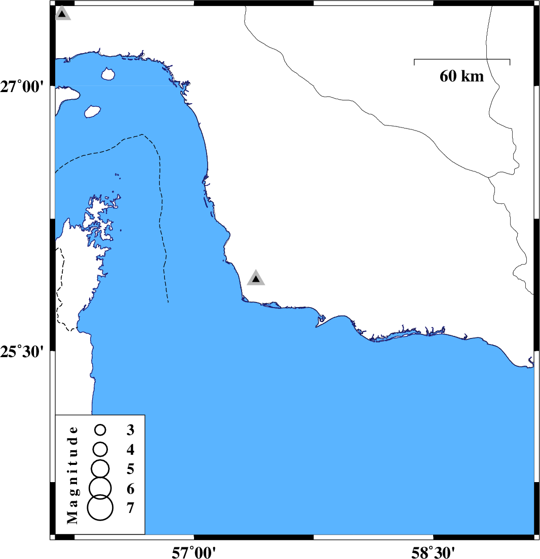 | 2020/01/11 | 09:50:15.1 | 13:20:15.1 | 25.95 | 57.63 | 10 | ML:3.6 | Hormozgan Province, 38 km North-West of Jask |