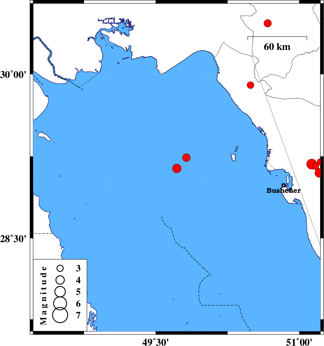 | 2020/01/08 | 03:46:46.7 | 07:16:46.7 | 29.16 | 51.17 | 10 | ML:3.1 | Bushehr Province, 12 km South of Borazjan | ||