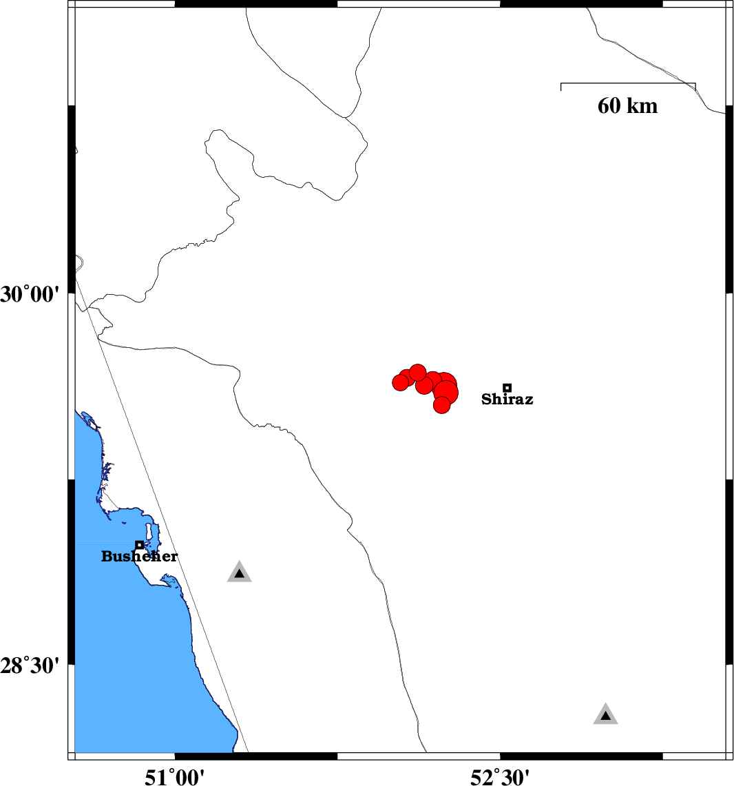 | 2020/01/30 | 12:45:13.9 | 16:15:13.9 | 29.68 | 52.12 | 10 | ML:3.5 | Fars Province, 40 km -West of Shiraz | ||