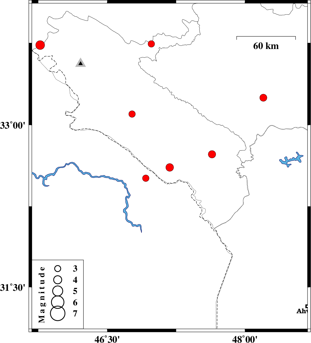 | 2020/01/01 | 22:58:42.6 | 02:28:42.6 | 32.51 | 46.92 | 14 | ML:3.3 | Iraq, 38 km South-West of Dehloran |