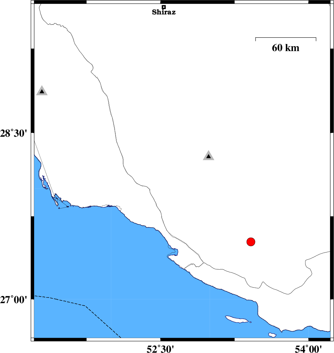 | 2020/02/28 | 20:45:53.2 | 00:15:53.2 | 28.15 | 52.72 | 13 | ML:3.6 | Fars Province, 46 km South-West of Qir va Karzin | ||