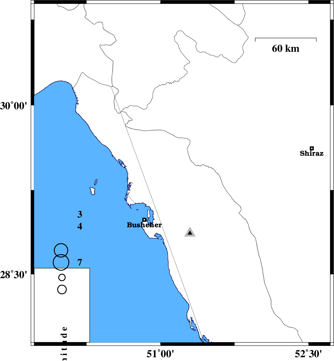 | 2020/03/27 | 15:48:52.6 | 20:18:52.6 | 29.39 | 51.22 | 10 | ML:3.6 | Bushehr Province, 14 km North of Borazjan |
