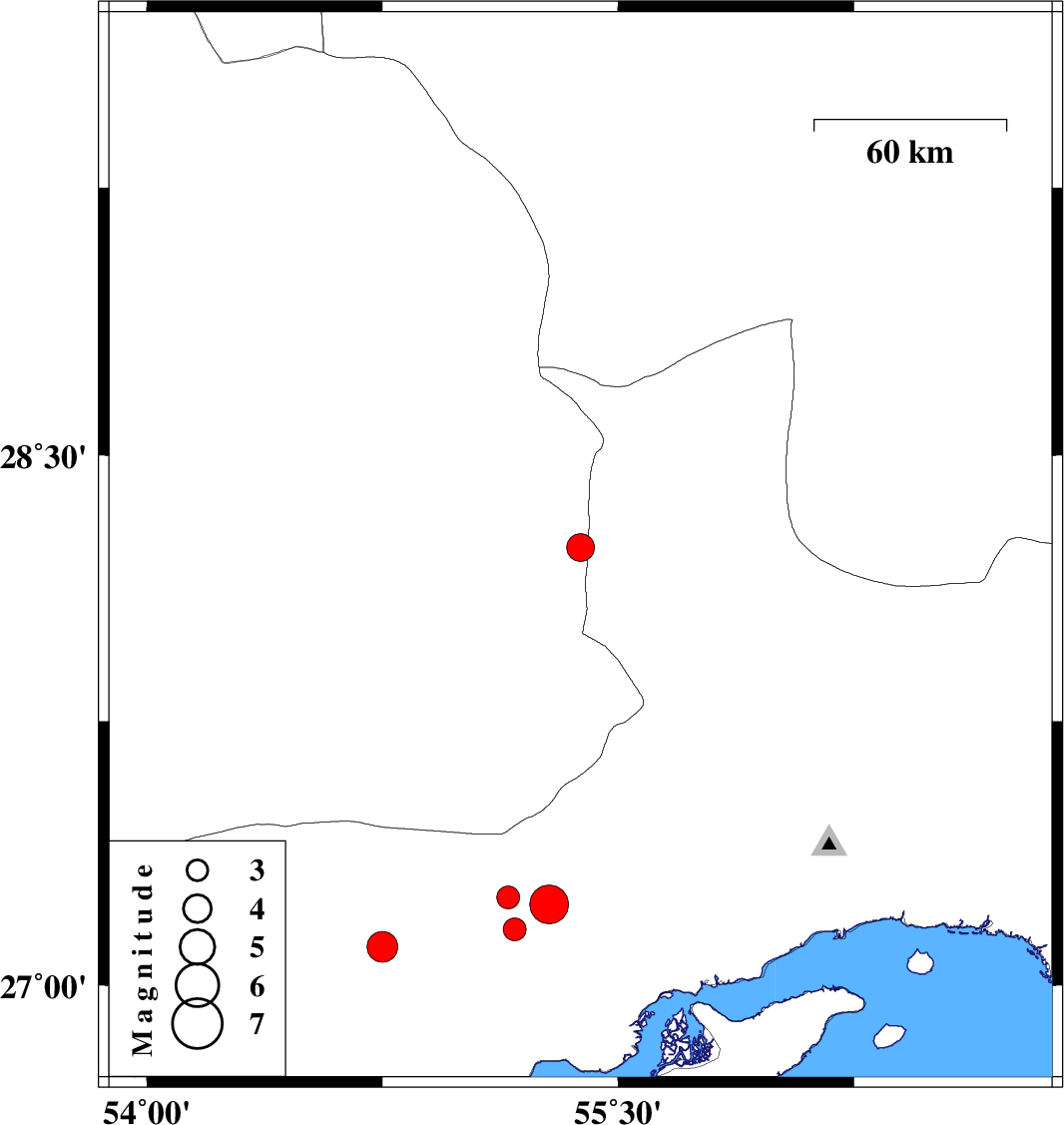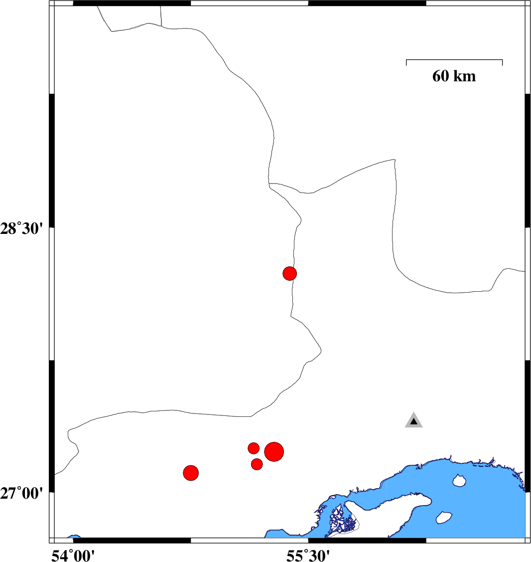 | 2020/03/03 | 11:31:27.4 | 15:01:27.4 | 27.11 | 54.75 | 25 | ML:4.4 | Hormozgan Province, 40 km -East of Bastak |