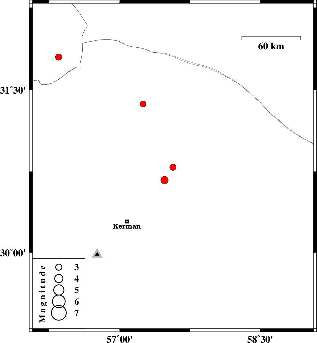| 2020/04/20 | 05:43:41.9 | 10:13:41.9 | 30.79 | 57.57 | 10 | ML:3.1 | Kerman Province, 73 km North-East of Kerman | ||