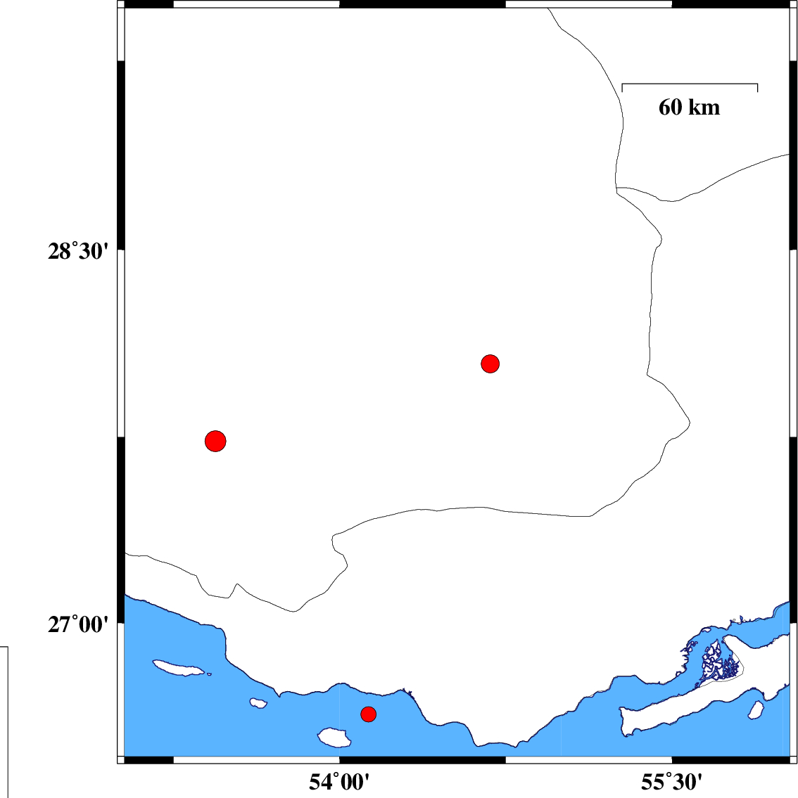| 2020/04/25 | 00:53:27.8 | 05:23:27.8 | 27.75 | 53.05 | 10 | ML:2.8 | Fars Province, 28 km North-East of Mehr | ||