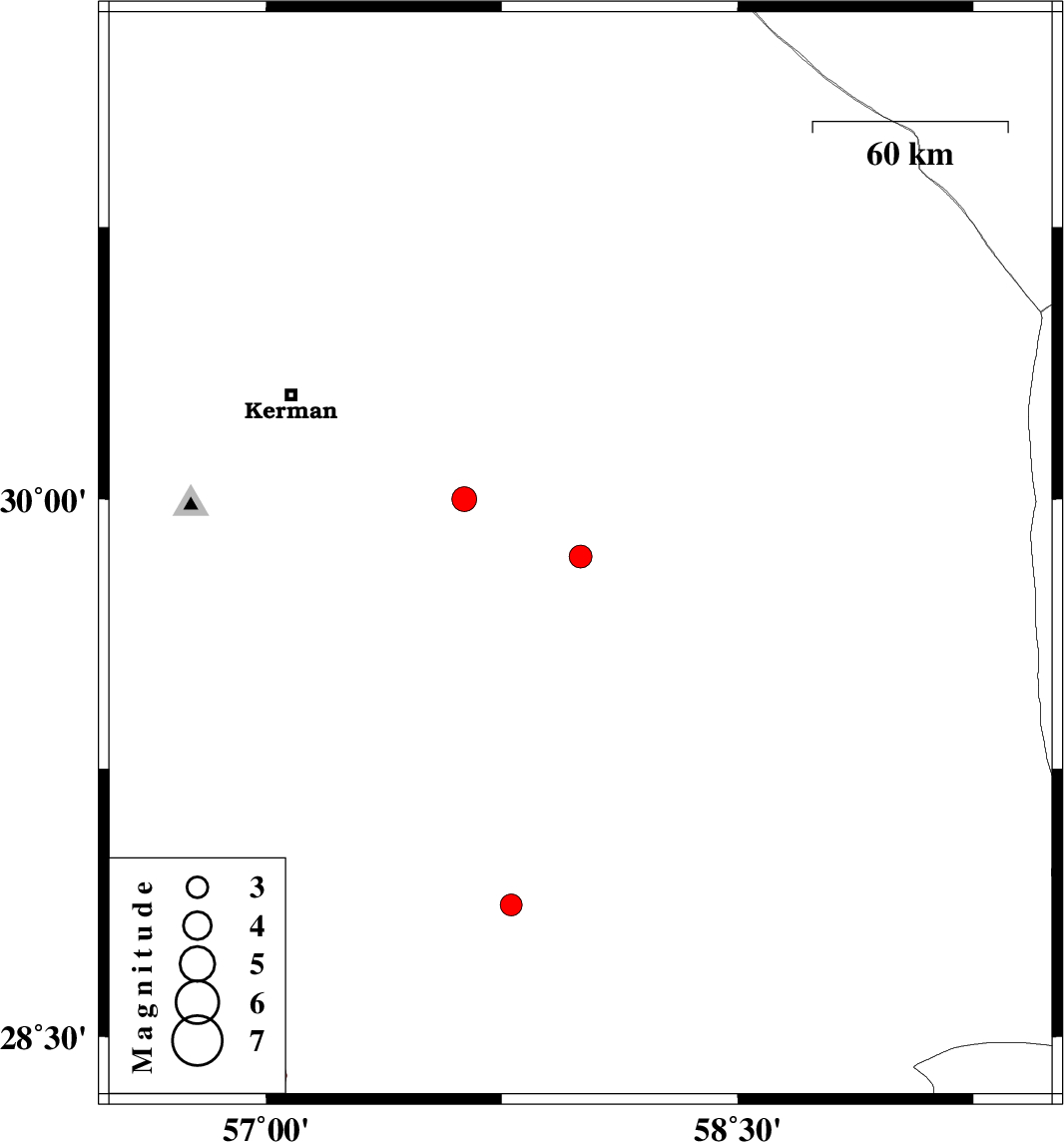 | 2020/05/19 | 05:59:11.0 | 10:29:11.0 | 30 | 57.63 | 10 | ML:3.5 | Kerman Province, 62 km South-East of Kerman | ||