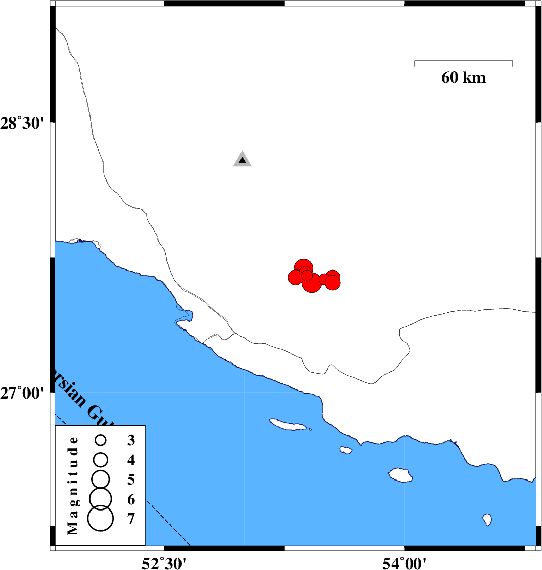| 2020/06/09 | 17:43:17.9 | 22:13:17.9 | 27.64 | 53.55 | 10 | ML:4.1 | Fars Province, 51 km North-East of Lamerd | ||