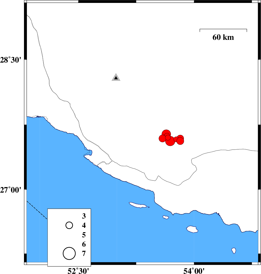 2020/06/09 19:44:54.5 00:14:54.5 27.6153.5510 ML:4.2 Fars Province, 49 km North-East of Lamerd