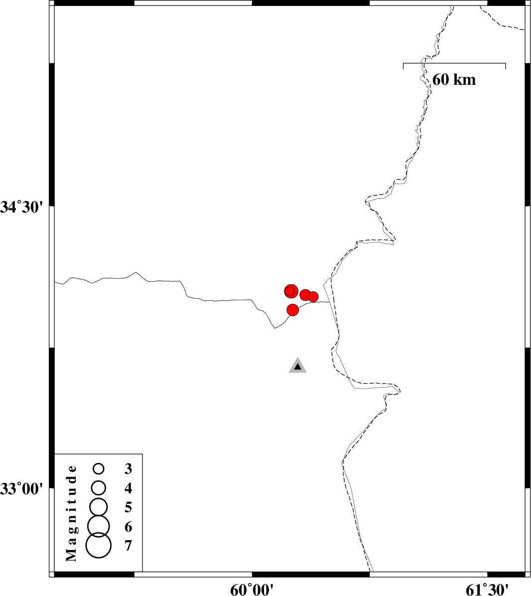 | 2020/06/13 | 03:58:17.2 | 08:28:17.2 | 34.05 | 60.24 | 10 | ML:2.7 | Khorasan(center) Province, 59 km South-East of Khaf | ||