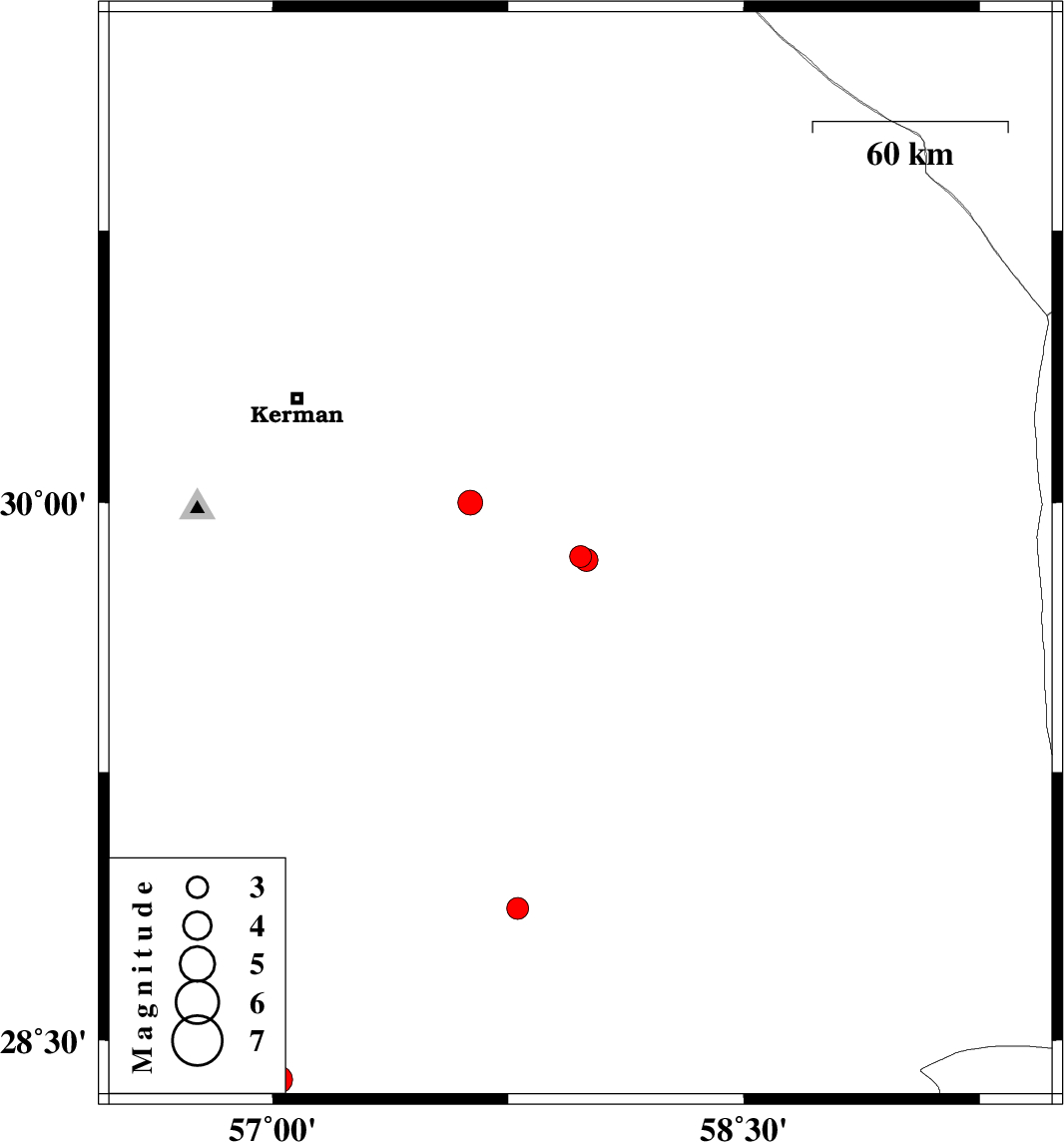 | 2020/06/09 | 00:20:06.2 | 04:50:06.2 | 29.84 | 58 | 10 | ML:3.3 | Kerman Province, 88 km North-West of Bam | ||
