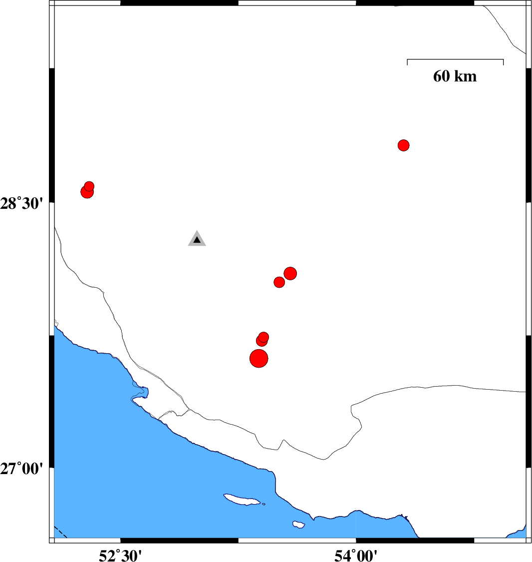 | 2020/06/21 | 08:05:47.2 | 12:35:47.2 | 28.1 | 53.58 | 15 | ML:3.7 | Fars Province, 45 km South of Jahrom | ||
