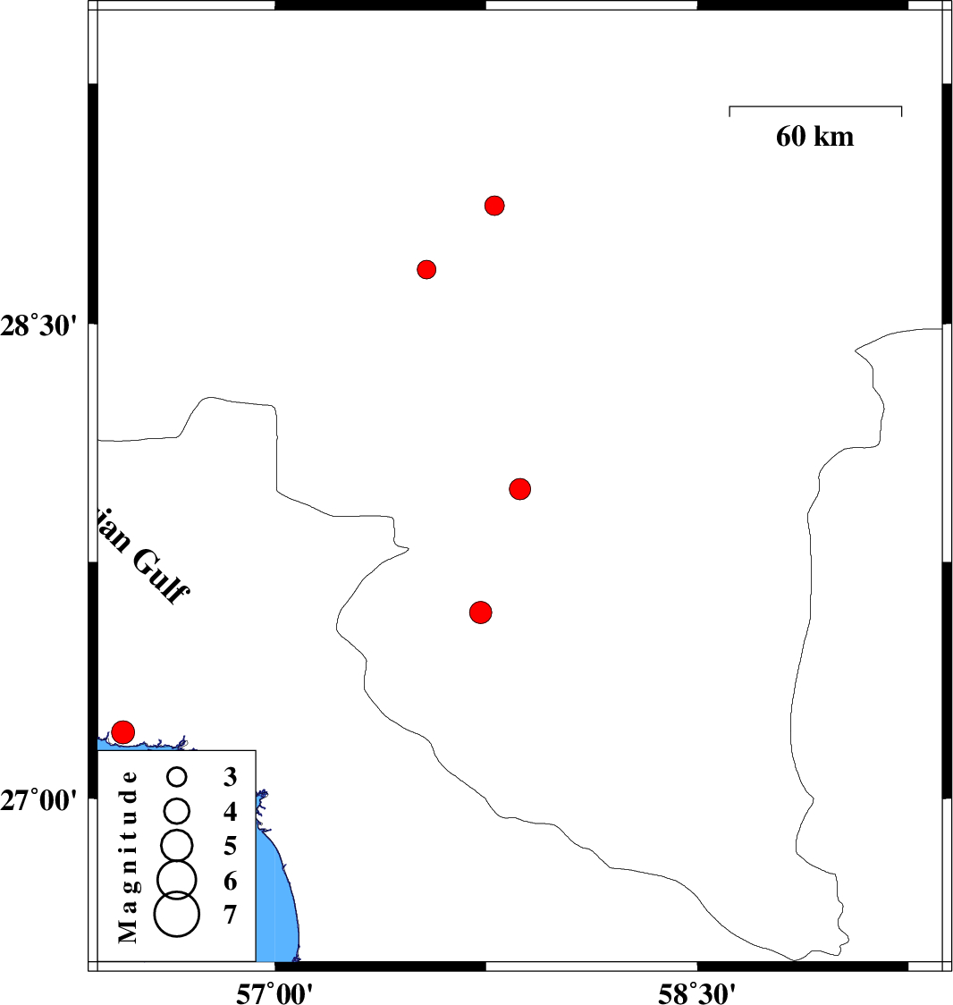 2020/06/27 | 07:28:31.5 | 11:58:31.5 | 27.59 | 57.73 | 15 | ML:3.5 | Kerman Province, 40 km South of Kahnuj | ||