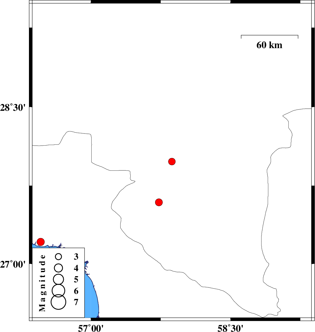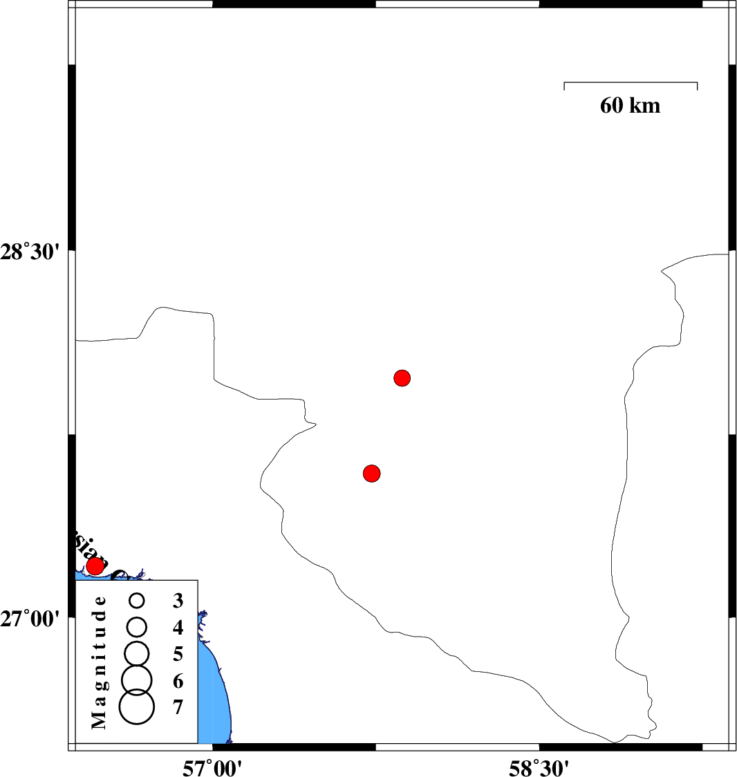 | 2020/06/27 | 07:28:31.5 | 11:58:31.5 | 27.59 | 57.73 | 15 | ML:3.5 | Kerman Province, 40 km South of Kahnuj | ||