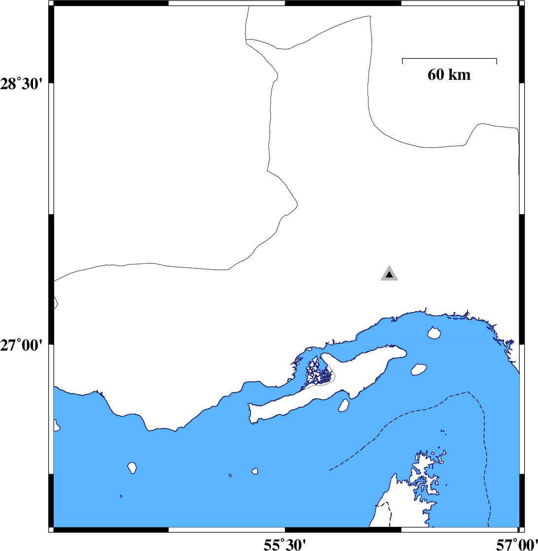| 2020/06/25 | 00:13:28.0 | 04:43:28.0 | 27.45 | 55.9 | 10 | ML:3.7 | Hormozgan Province, 48 km North-West of Bandar-e abbas | ||