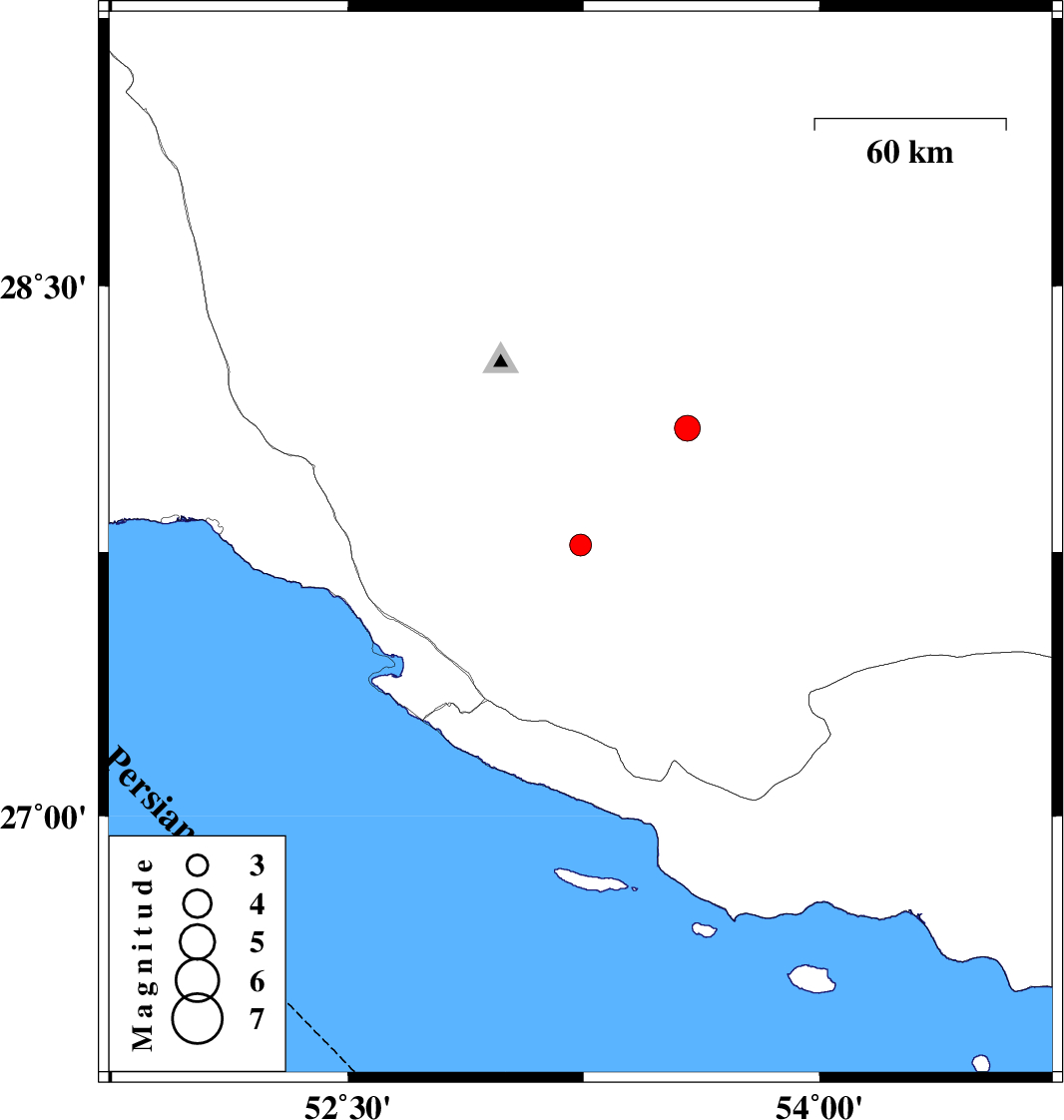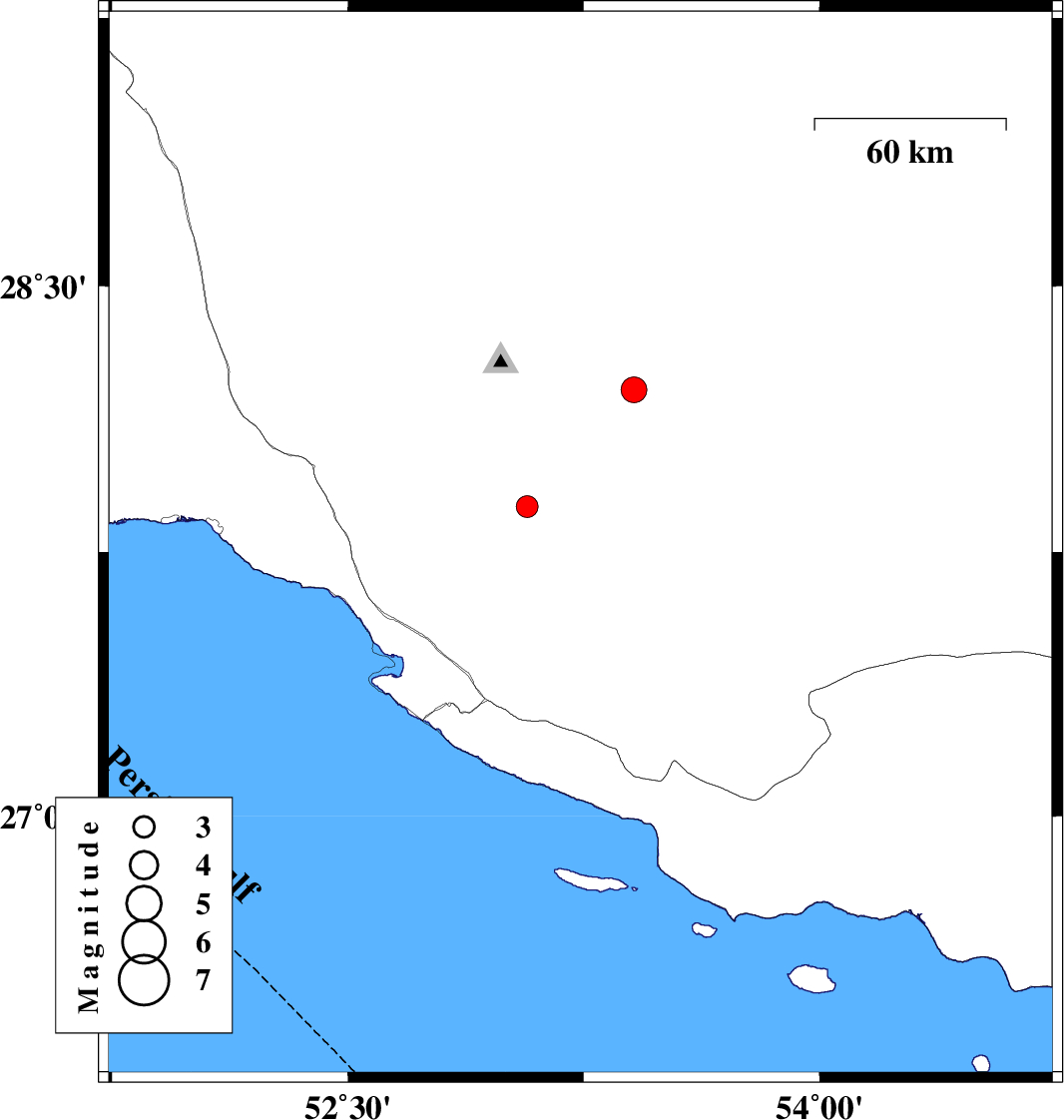 | 2020/06/21 | 08:05:47.2 | 12:35:47.2 | 28.1 | 53.58 | 15 | ML:3.7 | Fars Province, 45 km South of Jahrom |