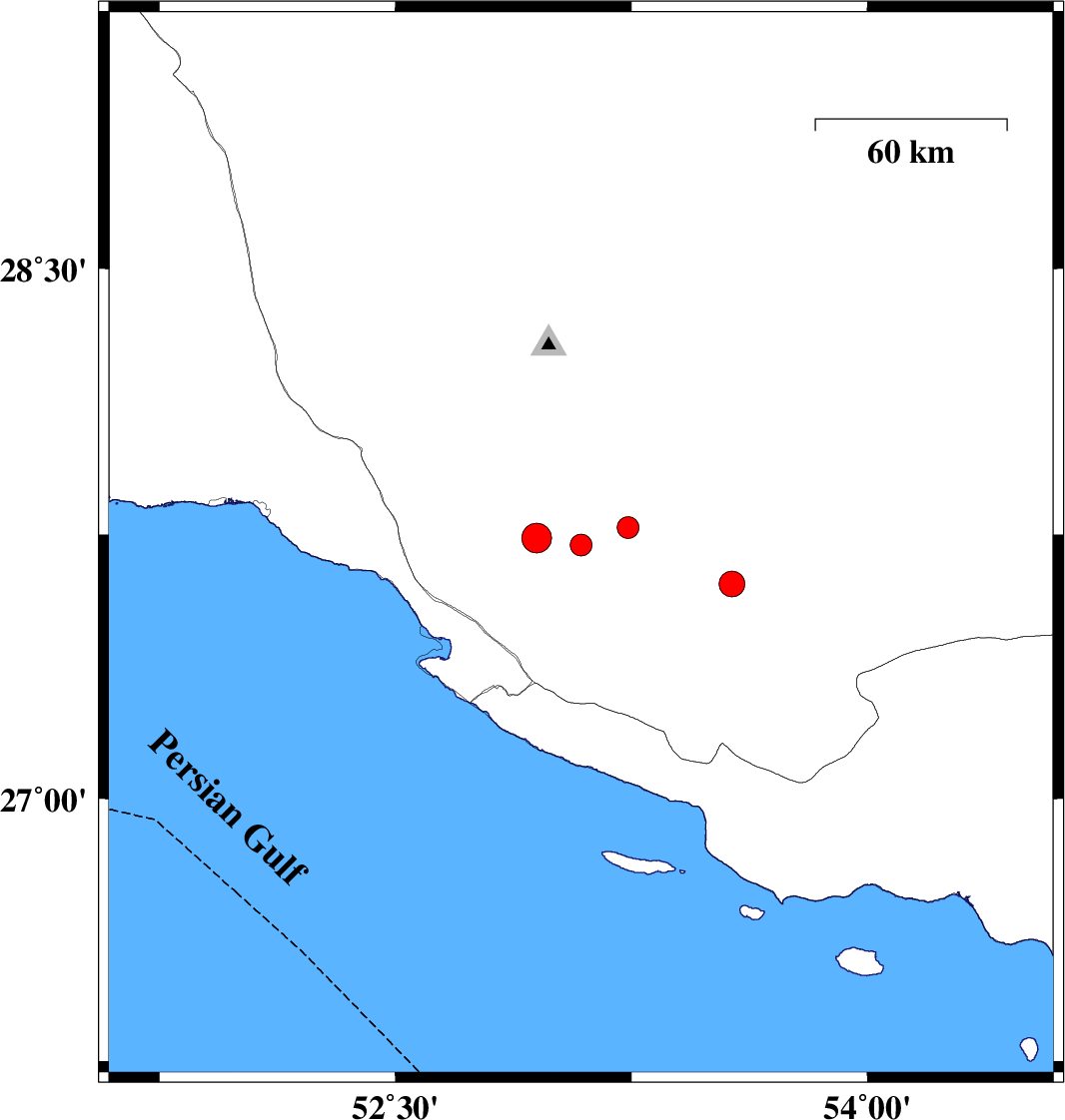 | 2020/07/04 | 09:04:28.1 | 13:34:28.1 | 27.61 | 53.57 | 10 | ML:3.7 | Fars Province, 50 km North-East of Lamerd | ||