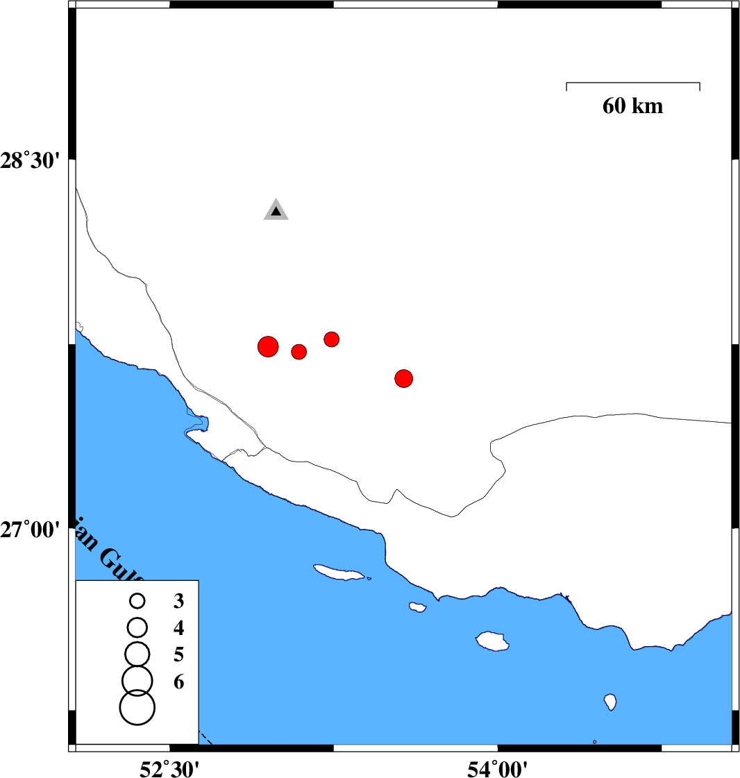 | 2020/07/02 | 00:29:16.7 | 04:59:16.7 | 27.741 | 52.949 | 12 | ML:4.2 | Fars Province, 22 km North of Mehr | ||