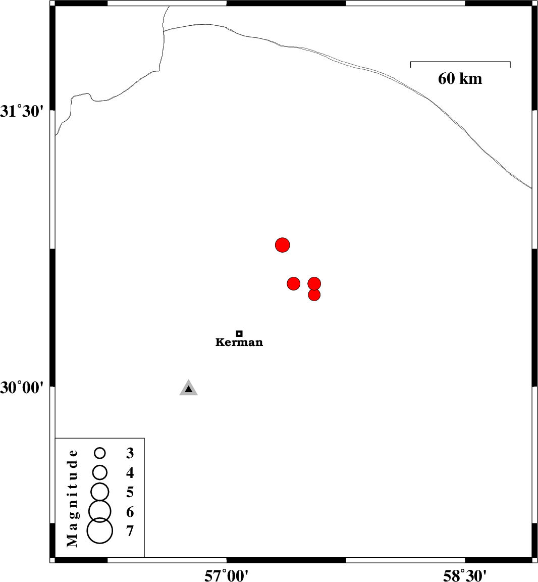| 2020/06/27 | 07:48:03.3 | 12:18:03.3 | 30.77 | 57.35 | 10 | ML:4.1 | Kerman Province, 60 km North-East of Kerman |