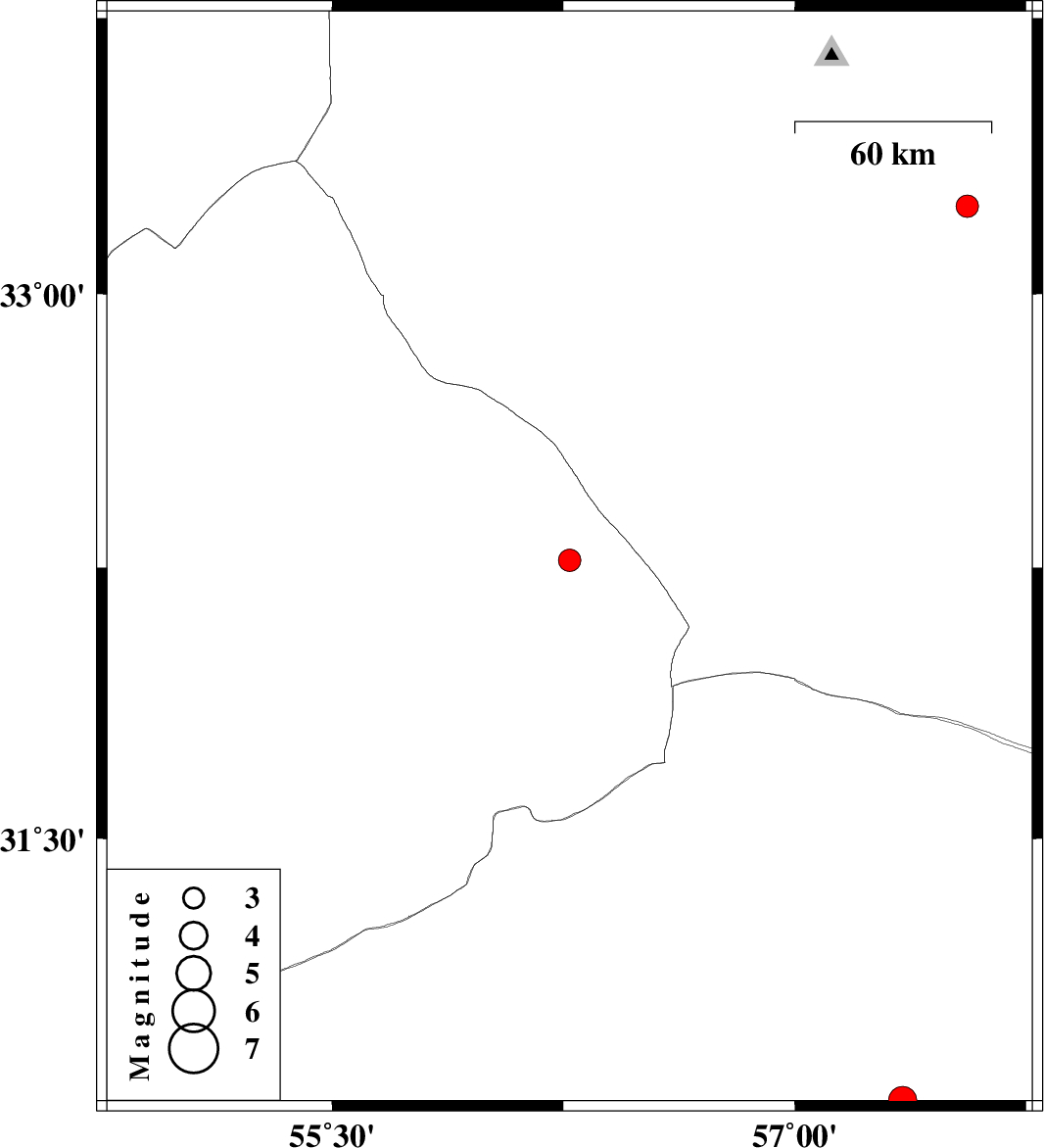 | 2020/07/19 | 01:15:27.5 | 05:45:27.5 | 32.27 | 56.27 | 24 | ML:3.2 | Yazd Province, 111 km North-East of Bafq | ||
