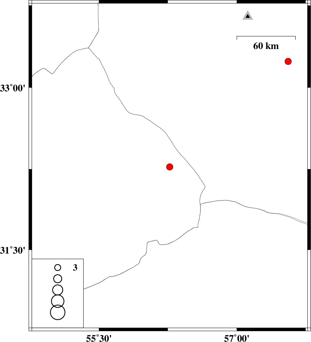 | 2020/07/16 | 01:34:07.4 | 06:04:07.4 | 33.24 | 57.56 | 10 | ML:3.3 | Yazd Province, 71 km South-East of Tabas |