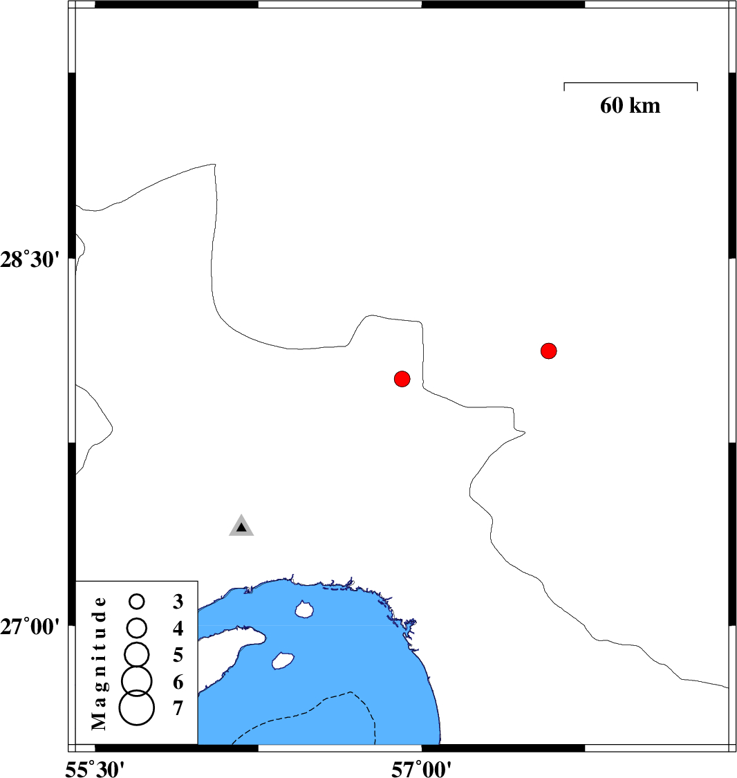 | 2020/07/13 | 01:20:36.6 | 05:50:36.6 | 28.124 | 57.584 | 12 | ML:3.3 | Kerman Province, 22 km North-West of Kahnuj |