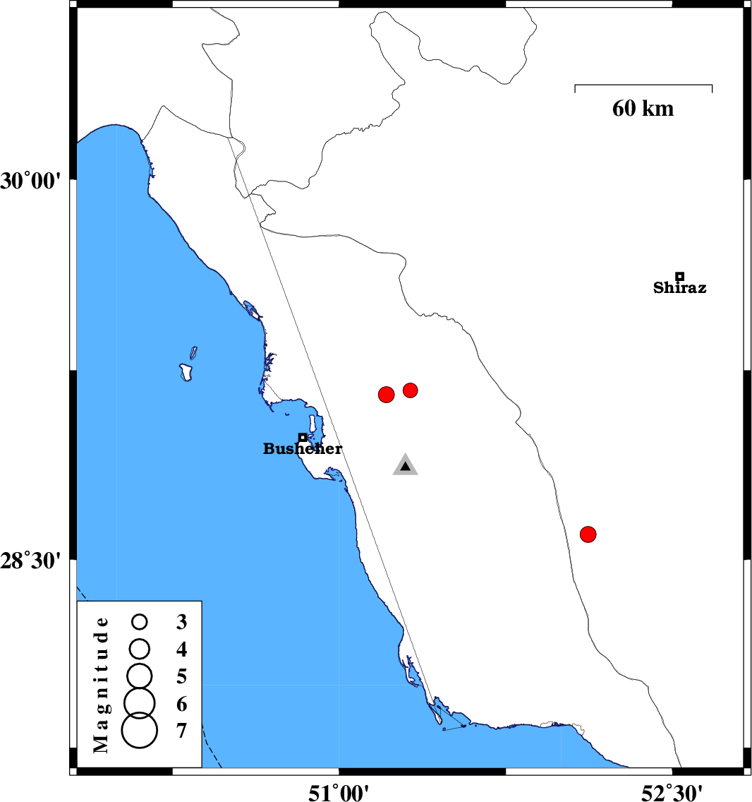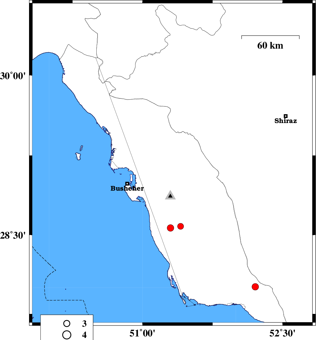 | 2020/07/21 | 12:26:17.5 | 16:56:17.5 | 29.154 | 51.212 | 12 | ML:3.3 | Bushehr Province, 12 km South of Borazjan | ||