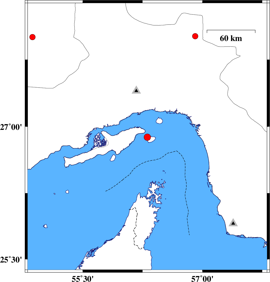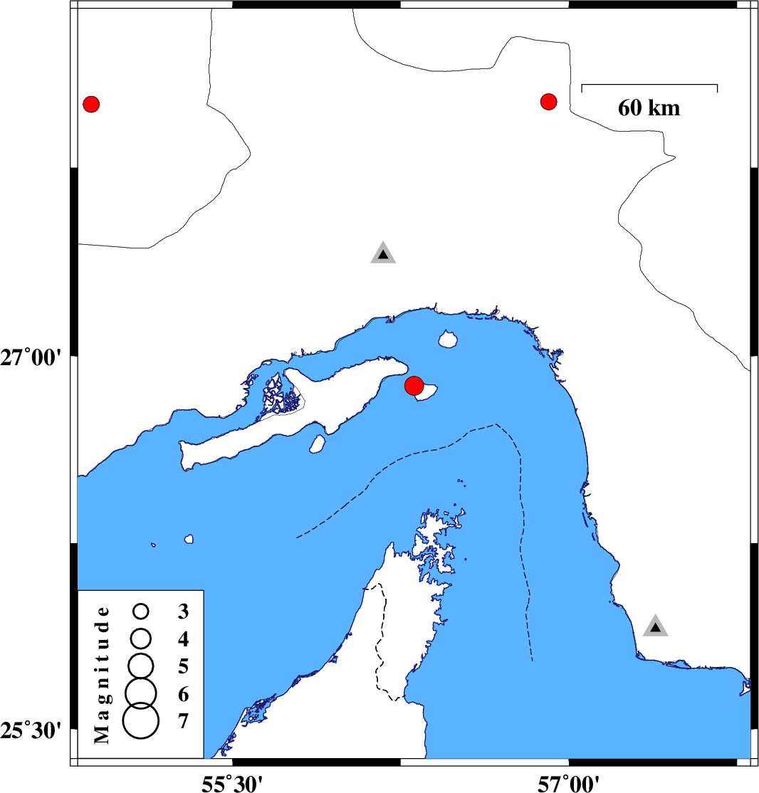 | 2020/07/25 | 17:47:18.3 | 22:17:18.3 | 26.88 | 56.31 | 10 | ML:3.8 | Persian Gulf, 10 km of Qeshm | ||