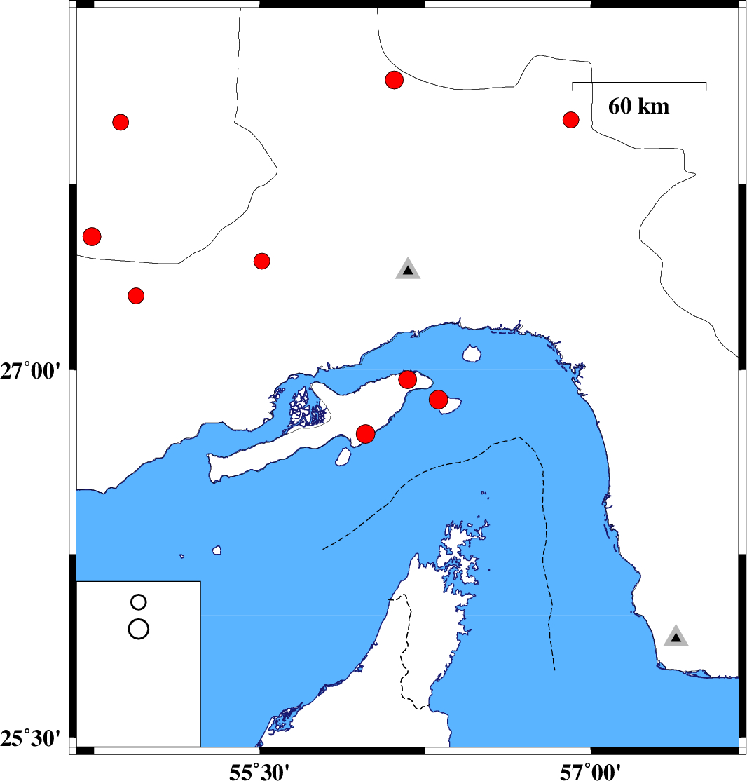2020/07/26 | 06:23:25.8 | 10:53:25.8 | 26.96 | 56.17 | 10 | ML:3.7 | Persian Gulf, 10 km of Qeshm | ||