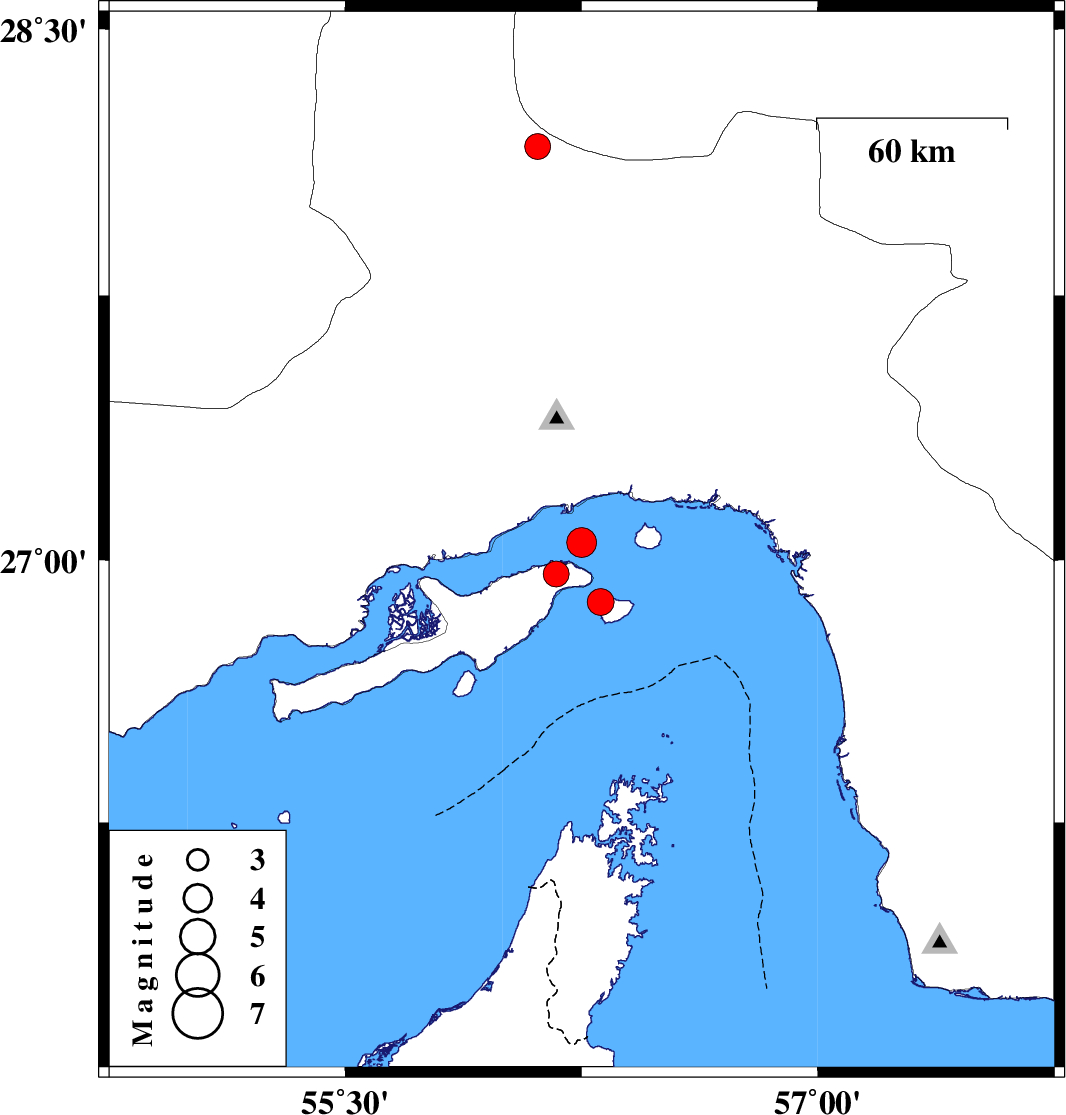| 2020/07/27 | 11:12:37.5 | 15:42:37.5 | 27.05 | 56.25 | 18 | ML:4.3 | Persian Gulf, 11 km of Qeshm | ||