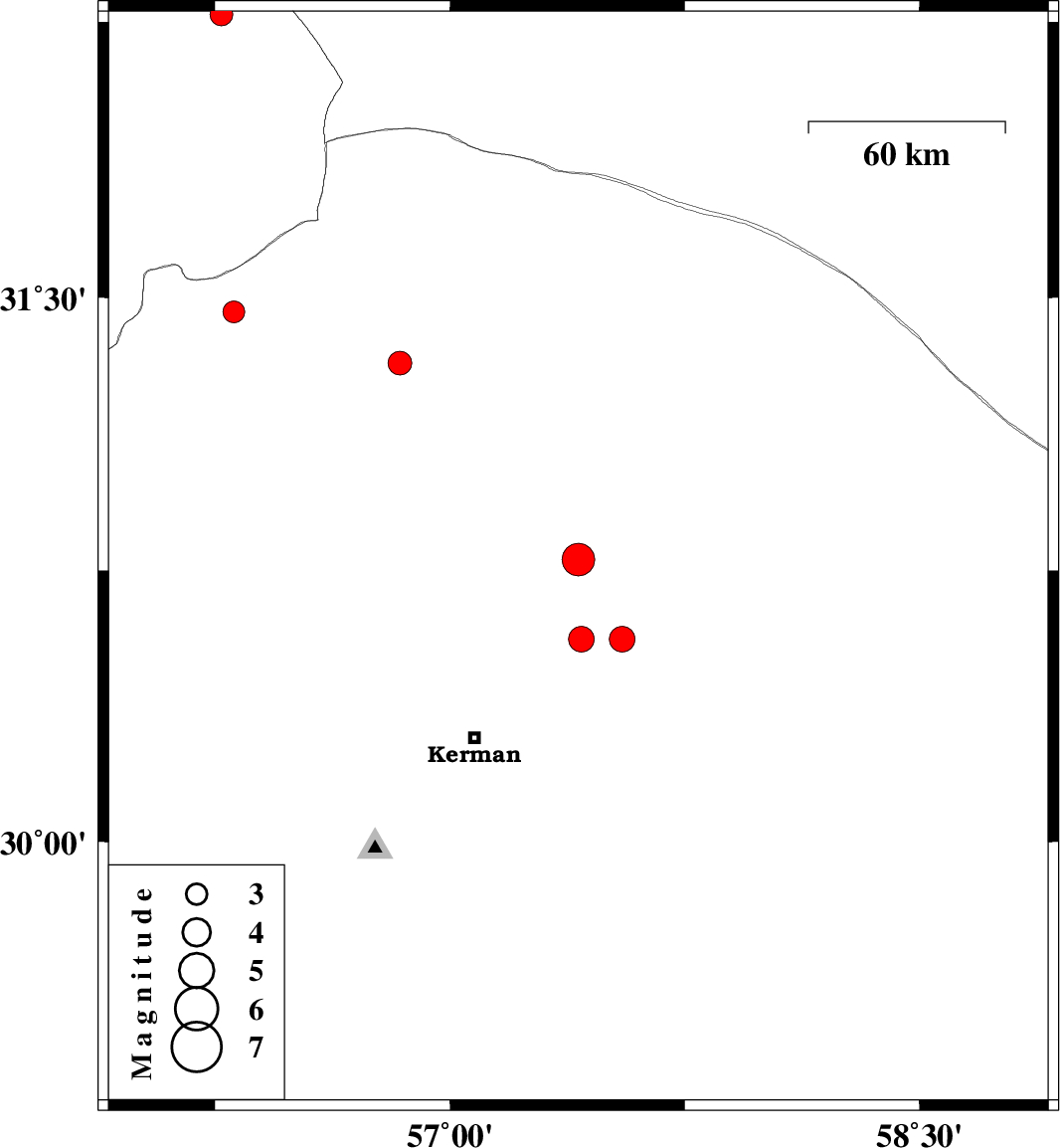 | 2020/07/17 | 10:57:33.9 | 15:27:33.9 | 30.56 | 57.42 | 10 | ML:3.6 | Kerman Province, 45 km North-East of Kerman | ||