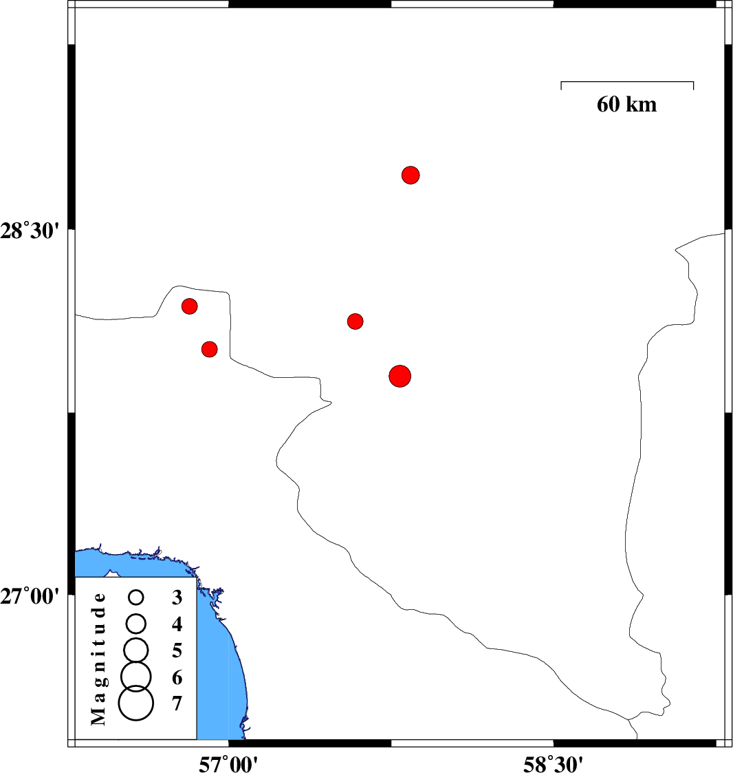 | 2020/08/01 | 02:24:50.1 | 06:54:50.1 | 27.9 | 57.79 | 10 | ML:4.5 | Kerman Province, 11 km of Kahnuj | ||