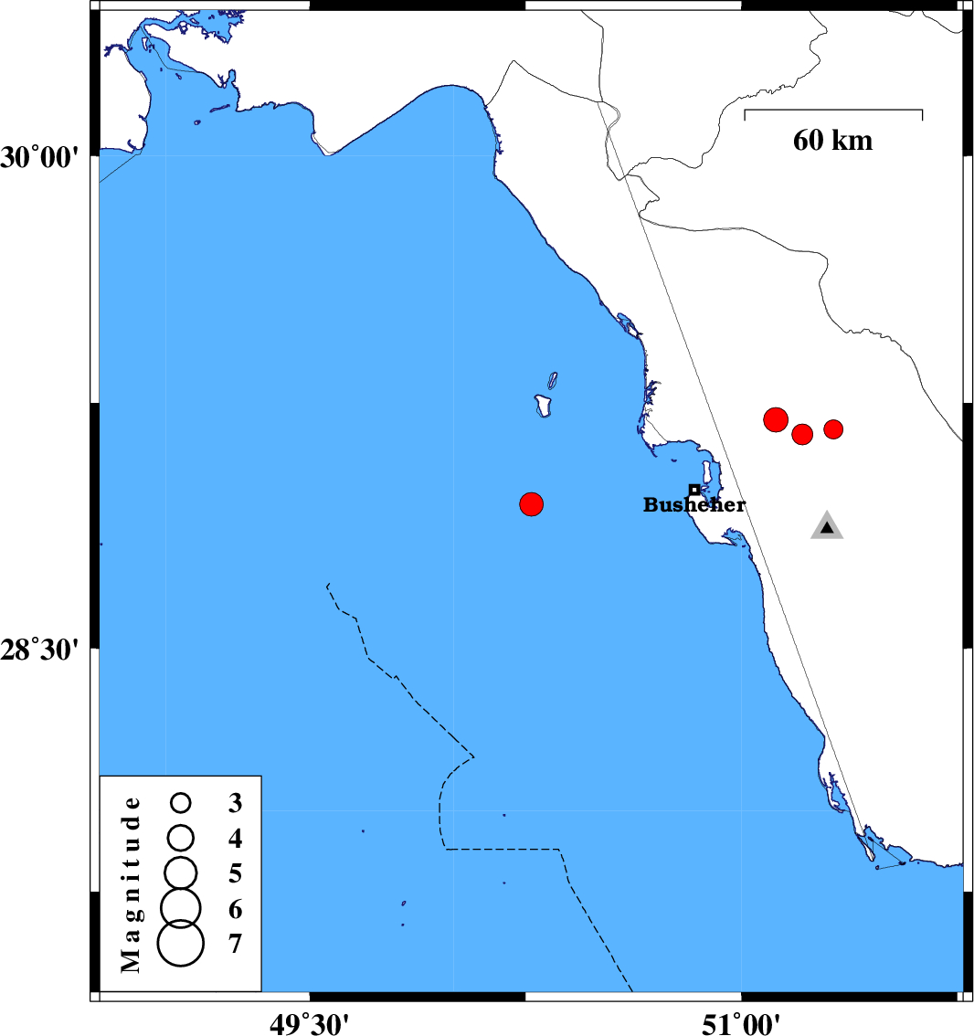 2020/08/10 | 06:40:32.1 | 11:10:32.1 | 28.94 | 50.27 | 22 | ML:3.7 | Persian Gulf, 55 km -West of Busheher | ||