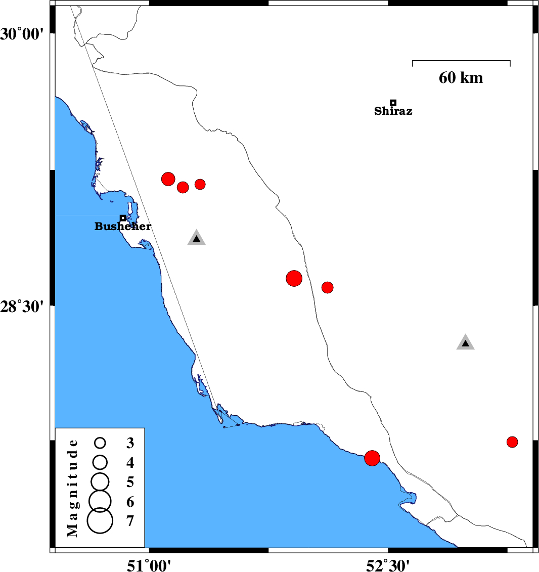 | 2020/07/21 | 12:26:17.5 | 16:56:17.5 | 29.154 | 51.212 | 12 | ML:3.3 | Bushehr Province, 12 km South of Borazjan | ||